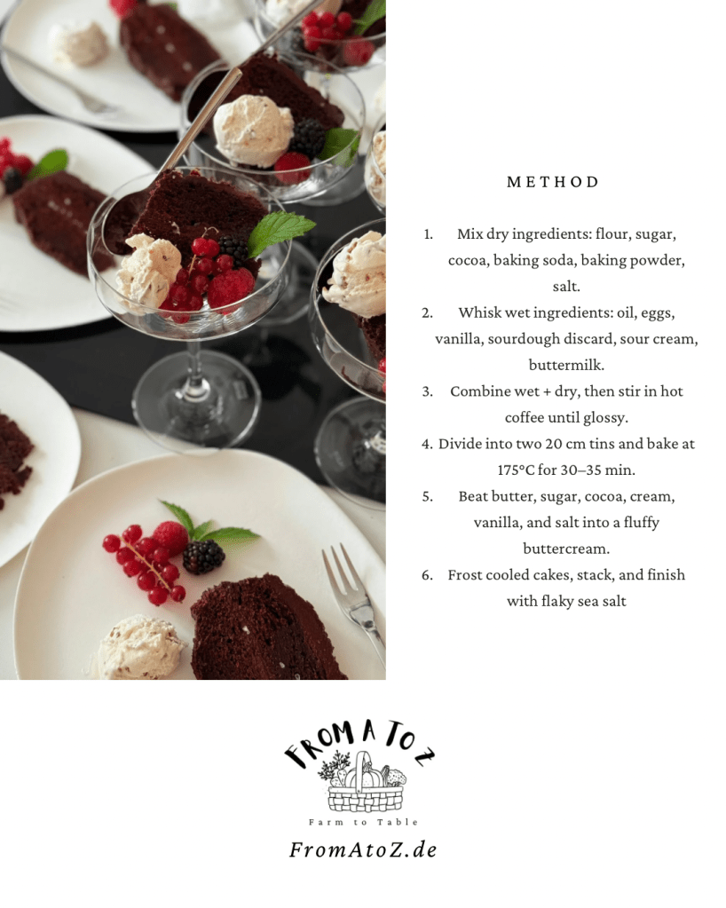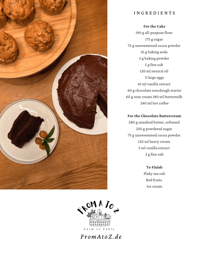 The sourdough starter is the quiet hero, keeping the cake moist for days and adding just enough tang to balance the richness of the chocolate. Don’t worry, it won’t taste like bread or fermentation, just chocolate, but better.